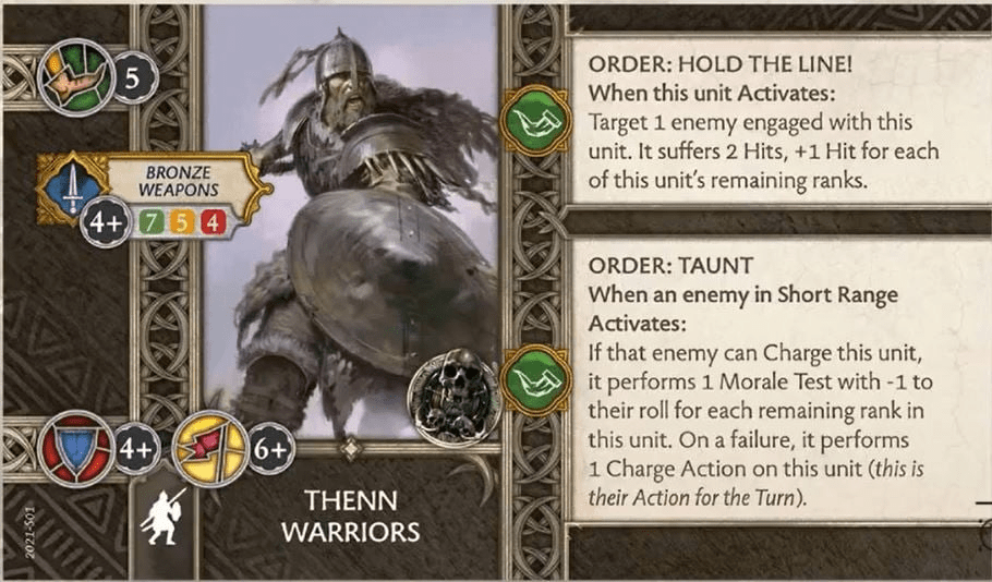 The Thenns are losing their “Unyielding” ability, but get a nice build-in synergy. Their first order “Hold the line” works perfectly with “Taunt”. Bring a unit to attack your Thenns, hopefully keep at least 2 ranks, and deal free hits when you activate them. For extra effectiveness, I could see a Walrus Clan Chieftain in them, which would turn them in a costly unit, but would definitely guarantee at least 4 free hits on the riposte.