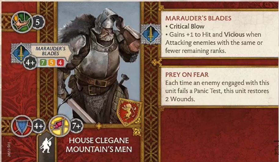 My favorite new change, as I love these models and all things Clegane… A very subtle change: their “Marauder’s Blade” ability now works on fewer or SAME ranks! They can now have Critical Blow, Vicious and 3+ to hit against most units they will end up fighting, due to their “Prey on Fear” ability, which will give them some necessary healing to come out on top. Like before, Mandon Moore attachment will bring them all the keywords in the game, but now it will probably even more deadly!