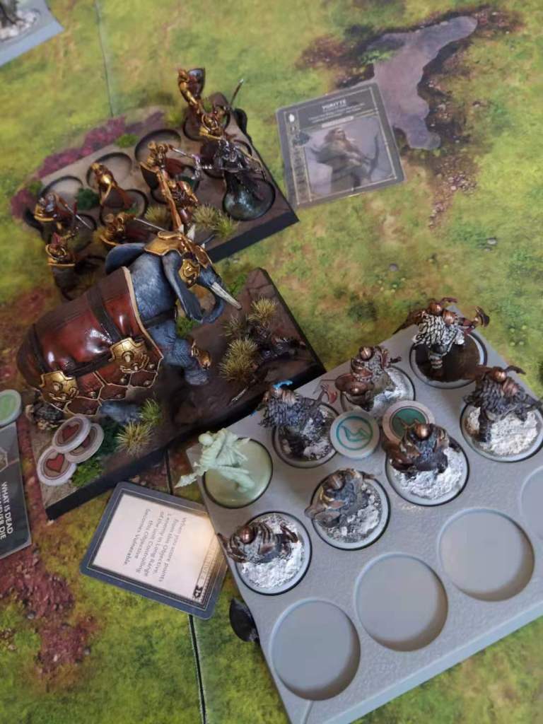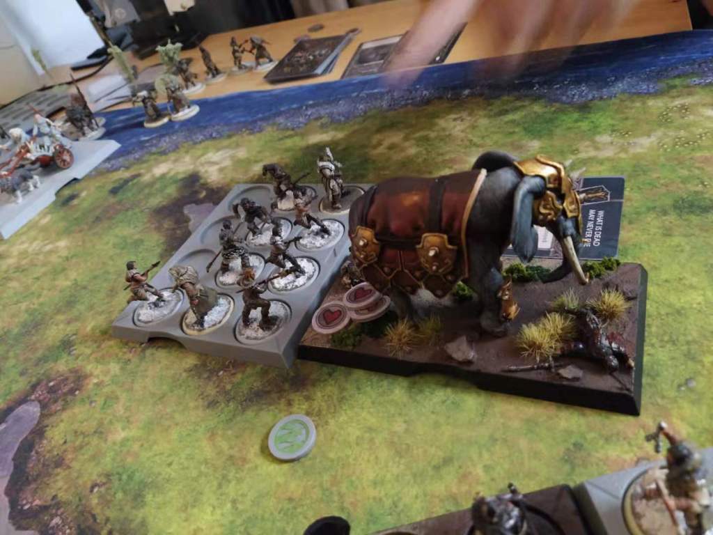 On round 2, Eric started. The Elephant was too much of a juicy target to not charge it, which is what he ended up doing with the Thenns. The charge was impressive, killing the elephant on the spot! Well, except it was a drowned elephant, and he would never die! With the Thenns already activated, the Elephant was not in real danger yet, but the trappers needed to be dealt with. Which they were, the Elephant stomping on them, for good measure.