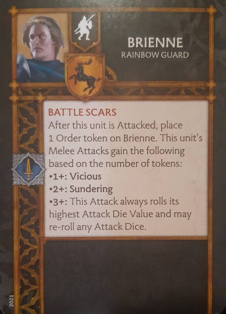 Let’s start with the unit itself. It has 2 ranks and 8 wounds, each wound representing 1 member of the Rainbow Guard and Renly Baratheon himself. 5 movement, 2+ to hit, 7 attacks on both ranks, 3+ defense, 5+ morale. Not bad! The 5+ morale is the worst part, but quite lore-accurate seeing how nearly half of them deflected to Stannis once Renly died. Still, the 5+ morale is transferred to surrounding friendly units thanks to “Rally Point”, making them a centerpiece for Renly’s loyalty average morale units. “Perseverance and Valor” completes the card nicely: a unit with only 8 wounds who really wants to attack will highly benefit from the 1 wound healing every time they do!