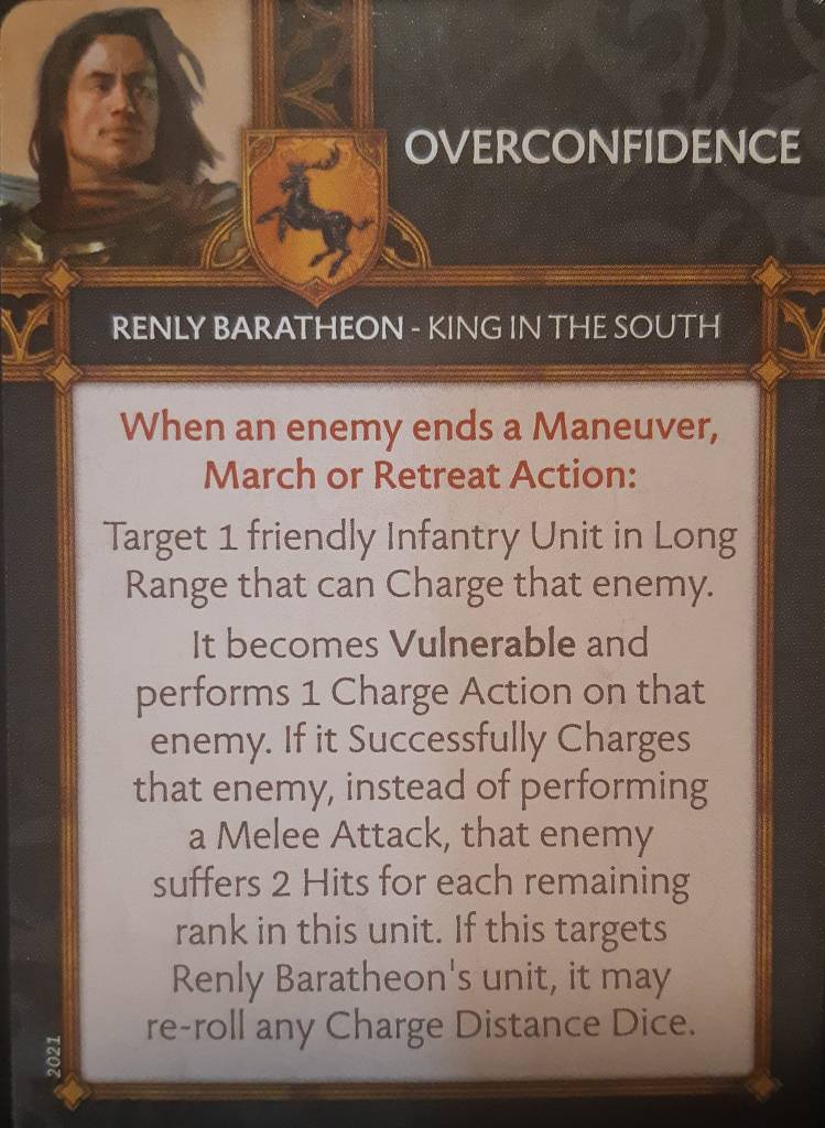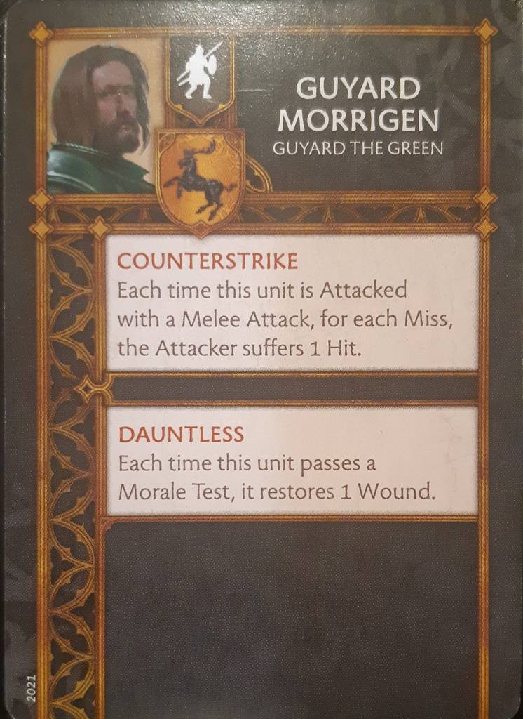 Side note: I’m quite sad that Guyard Morrigen is not double loyalty and usable in a Stannis army, since he went on to become the commander of Stannis vanguard at the Battle of the Blackwater, and his profile would have synergized fantastically with Stannis units. Same with Bryce Carron, a Queensmen unit with “Taunt” would have been particularly nice…