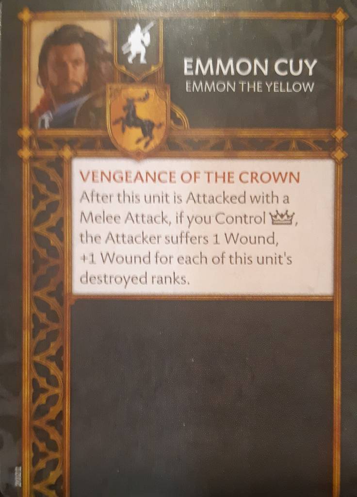 Emmon Cuy brings “Vengeance of the Crown”, like Boros Blount in the Kingsguard. This is a Crown zone dependent ability, and a retaliation one, which means is quite easy to play around for the opponent. As such I don’t really like it, although I could see it on a Pikemen unit to make the opponent second-guessing attacking them.