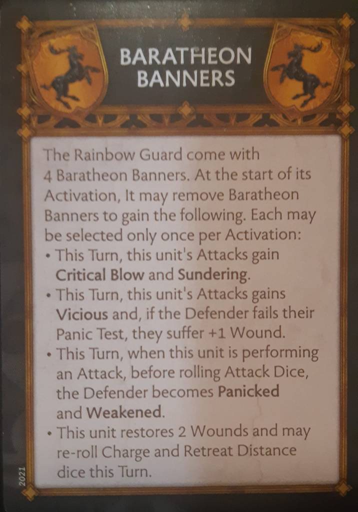 First, his unit gets “Swift Strike”, meaning they can charge and retreat in one single turn, allowing them to decide the tempo of the game, while forcing their opponent to make pivoting decisions. Bring a Thorn Watch or Riders of Highgarden unit and watch your opponent struggle on choosing which unit to show his front and flank to! Thanks to their Baratheon Banners, the Rainbow Guard can also reroll their charge distance roll, which makes their retreats a very dangerous threat for their opponent.