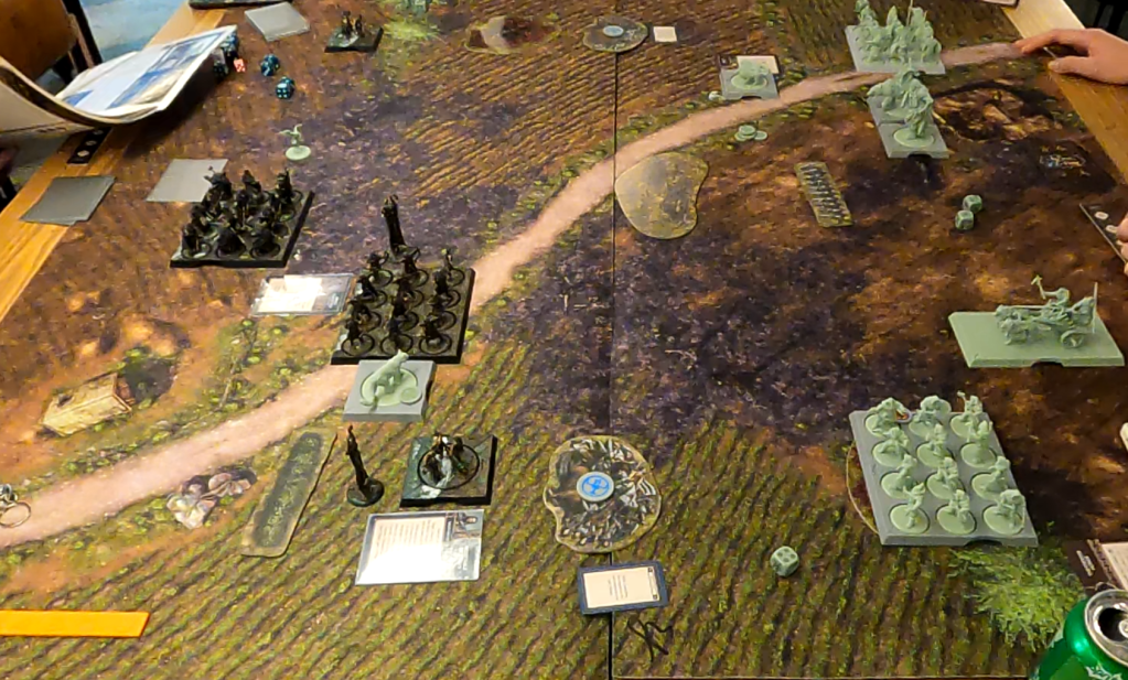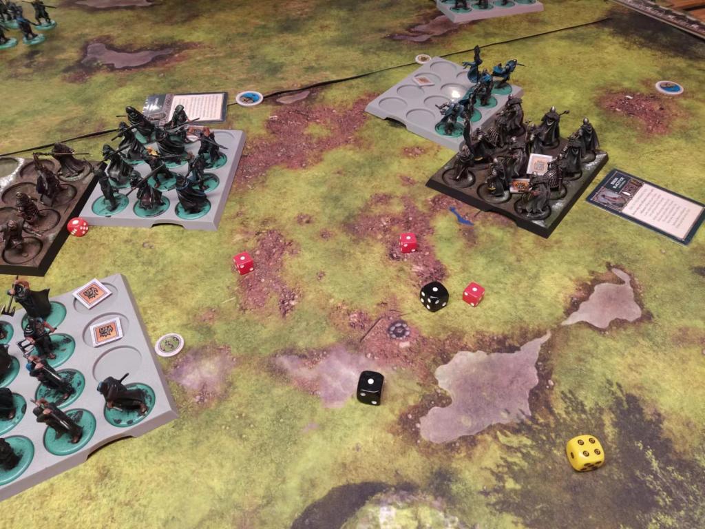 On the left flank, my Drowned Men are in a bit of trouble, managing to survive a Thenn charge and a Wolf Pack charge, but not enough: with the Wolf Pack cancelling abilities AND tactics cards, they die, as I can’t use What Is Dead to bring them back from a “Commanding Bond” charge…