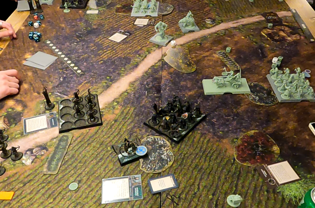 They die and I place a Corpse pile further away, to bring my Reavers with a nice outflank, straight on the objective! Unfortunately for me, he gets all his “Summon companion” cards and pops both his Cat and Wolf Pack behind me, while Varamyr gets the first objective and his Thenns move forward to meet my Reavers…